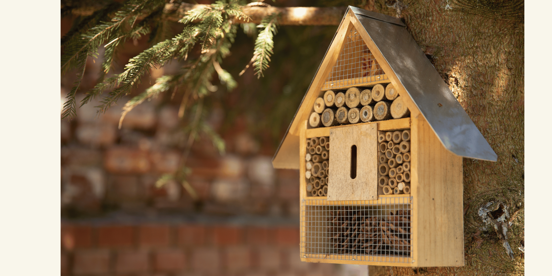 - Seção de troncos: Coloque pequenos troncos ou galhos de árvores com furos (cerca de 6-10 mm de diâmetro) para atrair abelhas solitárias ou besouro.