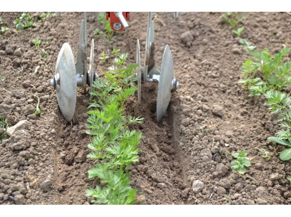 Usando a posição de ranger, os Bio-discos cobrem a fileira com terra, sufocando assim as plântulas de ervas daninhas. É a ferramenta ideal para mudas de feijão, cebola ou vazamento.