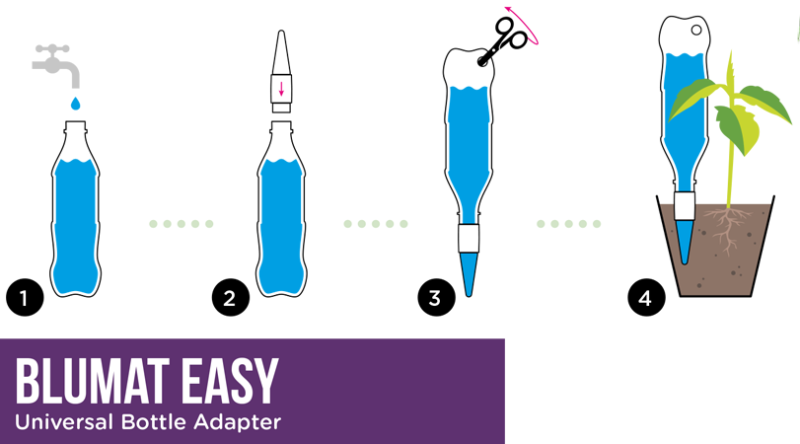 É um sistema de irrigação baseado na necessidade de irrigação das plantas adaptado a garrafas plásticas. Quase qualquer garrafa plástica padrão entre 250 mL e 2 L pode ser usada com o Blumat Easy. Basta encher o frasco, instalar o conta-gotas e fazer um pequeno orifício na extremidade oposta ao conta-gotas para evitar vácuo. O Blumat Easy é capaz de fornecer 200 mL de água por dia.