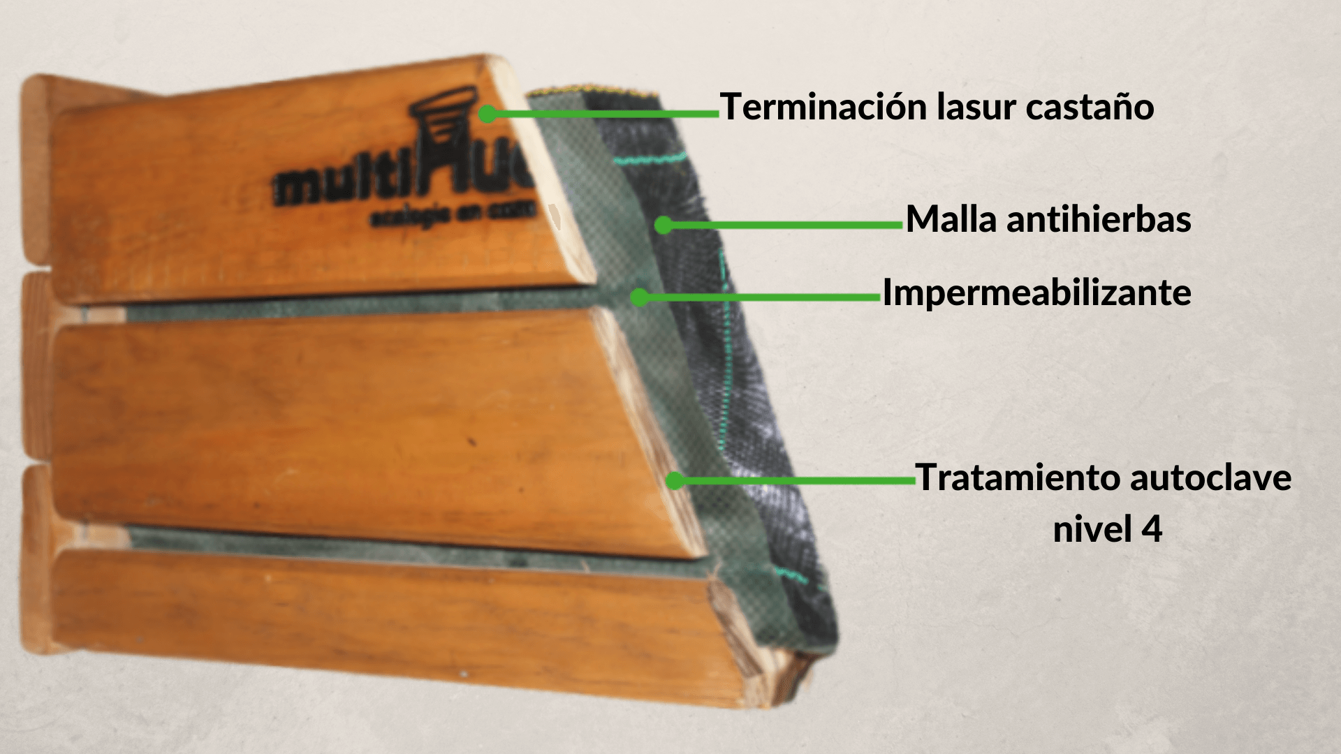 A gaveta é composta por um interior de forro duplo. O primeiro é um geotêxtil impermeável, perfurado para melhorar a ventilação e drenagem dos lixiviados que podem ser gerados durante o processo. O segundo é um revestimento feito com uma malha anti-ervas daninhas que irá reter o substrato e as minhocas.