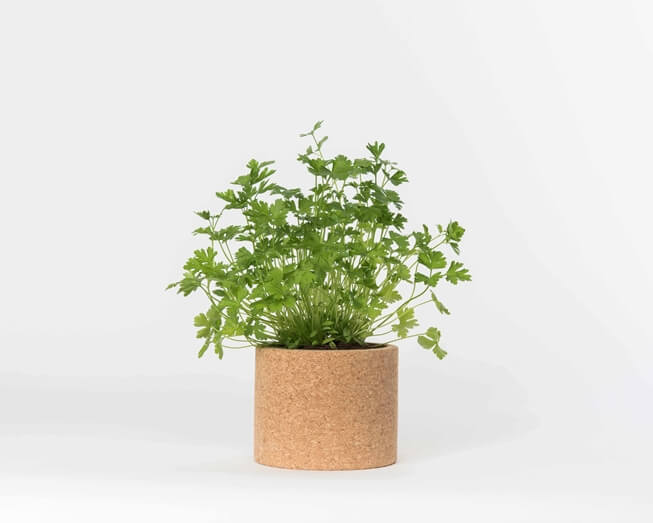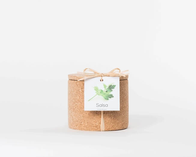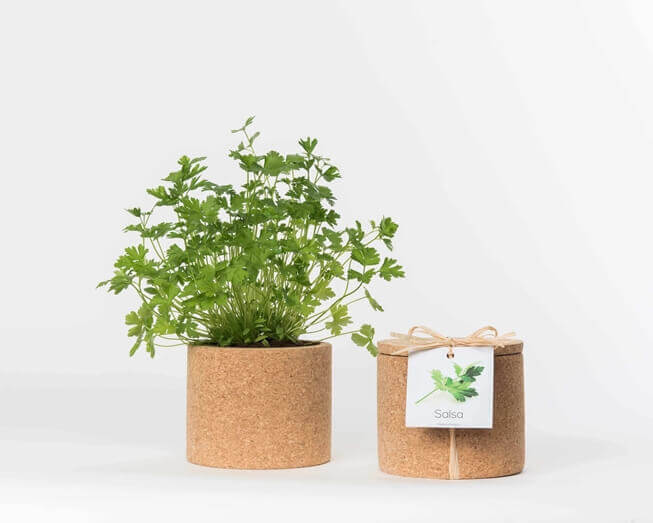 Um pote de cortiça com 12cm de diâmetro x 10,5 cm de altura, bolas de argila, uma embalagem com substrato, um pacote de sementes biológicas e instruções para cultivo. O pote de cortiça é reutilizável e as sementes são suficientes para cultivar várias vezes.