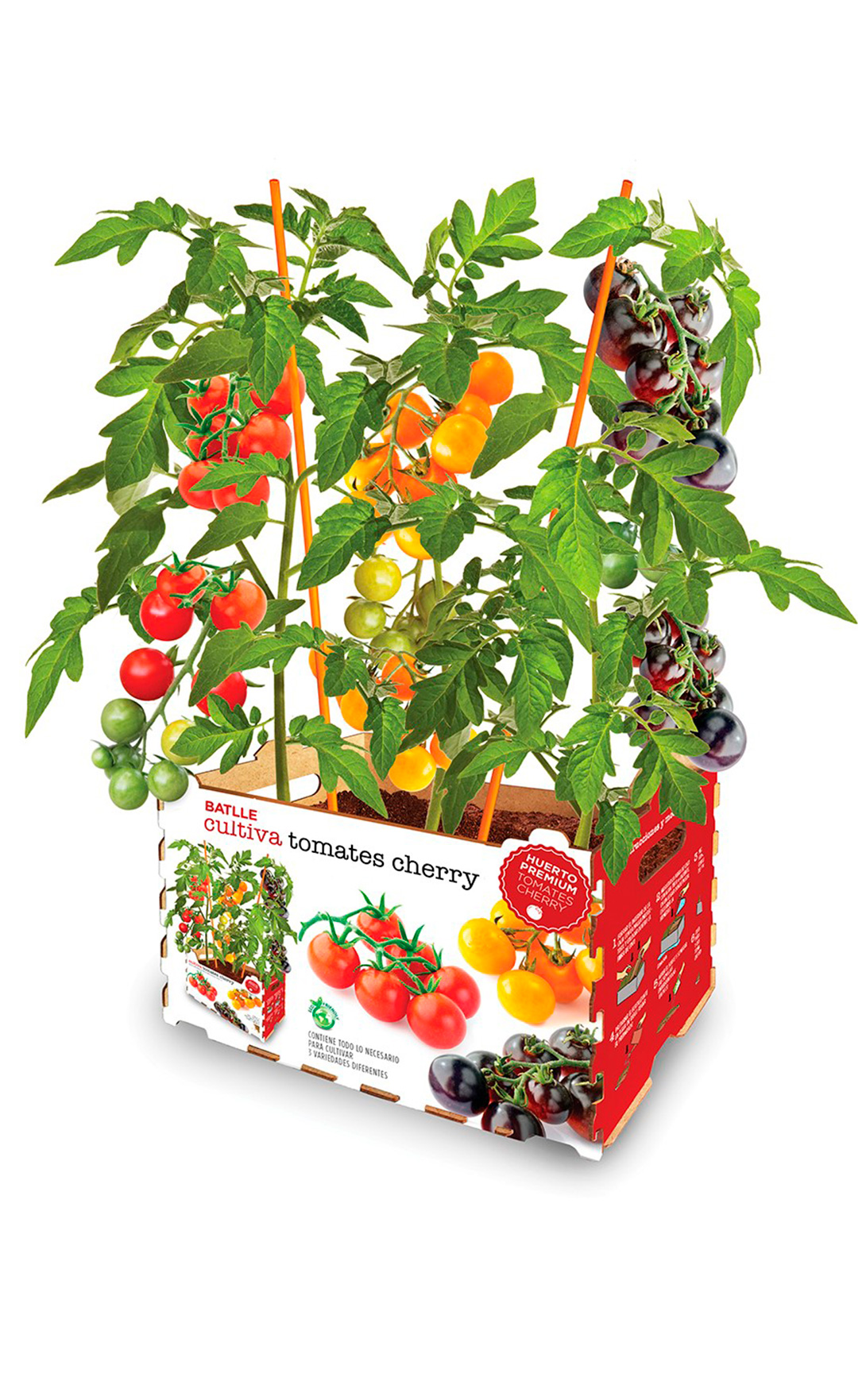 Contém tudo o que precisa para cultivar 3 variedades de Tomate Cereja: Vermelho, Amarelo e Preto.