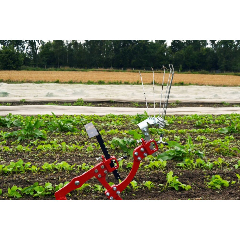 A lâmina corta a vegetação enquanto a grade dentada traz as mudas previamente cortadas para a superfície. Desta forma, melhora-se a qualidade da sacha e ajuda a prevenir o transplante de ervas daninhas.