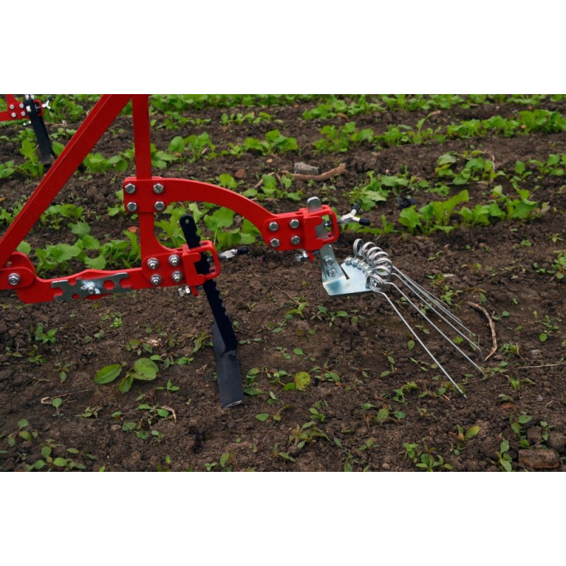 O acessório de ferramenta secundário é uma opção que pode ser adicionada à enxada de roda única / roda dupla para combinar duas ferramentas uma atrás da outra. Este conjunto é usado principalmente para "acabamento" do trabalho feito pela lâmina com uma grade de dentes.