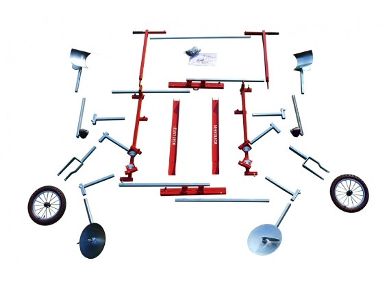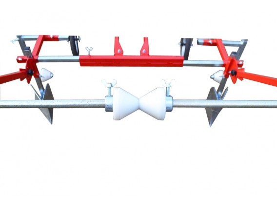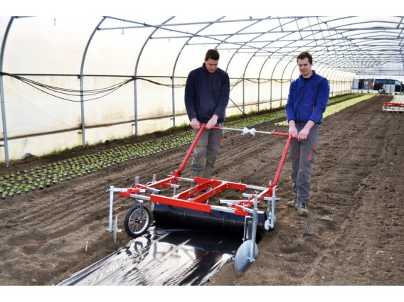 Esta máquina de assentamento totalmente ajustável pode levar rolos entre 90 e 150 cm de largura. Deve ser operada por dois operadores que puxam a máquina de assentamento. O sulcador na frente da máquina corta o solo e escava o sulco, o rolo de palha de plástico é desenrolado, esticado e esticado através da base do sulco pelas rodas. Os discos parabólicos na parte traseira da máquina varrem o solo sobre as bordas da folha.