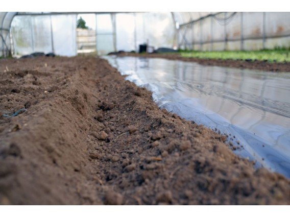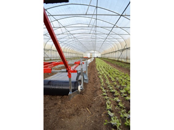 Máquina desenroladora, fixadora de plástico ou de camada biodegradável. Esta ferramenta facilita e acelera a colocação de cobertura do solo.