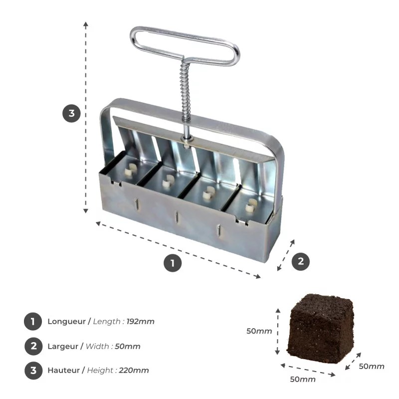 Fabricadas em aço galvanizado resistente, estas prensas de blocos de solo são uma das ferramentas mais eficientes e económicas disponíveis para os viveiros, não necessitando de manutenção. O modelo de 4 blocos é o mais versátil da gama. Produz quatro blocos de composto de 5 cm de diâmetro de cada vez com um único movimento da mão, graças ao seu mecanismo de mola. As inserções em forma de cubo podem ser acopladas para criar cavidades para o transplante de mini blocos do modelo de 20 blocos. Também é possível acoplar pinos para criar orifícios para estacas ou sementes maiores. Note que os pinos para sementes estão incluídos neste produto, mas as inserções em forma de cubo e os pinos devem ser adquiridos separadamente, se necessário.