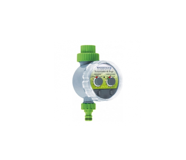 Temporizador de rega analógico. Permite para agendar um horário de irrigação de 1 minuto até a duas horas e a frequência de irrigação em períodos de 1 hora até uma semana. Adaptável a qualquer torneira padrão.
