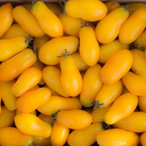 Um tomate amarelo com uma forma alongada.